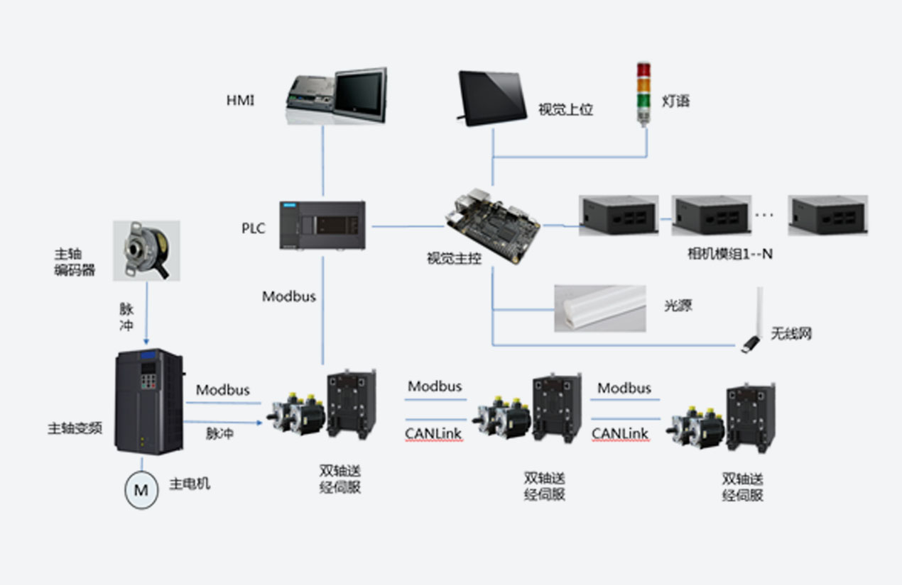 拉幅定型機方案,采用匯川運動型PLC,使用虛主軸+電子分頻方案,同步精度高、響應(yīng)快。采用MD810多機傳動變頻器,共直流母線排布,同時導(dǎo)入新一代同步機節(jié)能算法,整車節(jié)能10%以上。定型機物聯(lián)網(wǎng)系統(tǒng),支持遠程調(diào)試,故障預(yù)診斷;定型機生產(chǎn)管理系統(tǒng),支持成本核算,智能排序,工藝參數(shù)存儲與下發(fā)