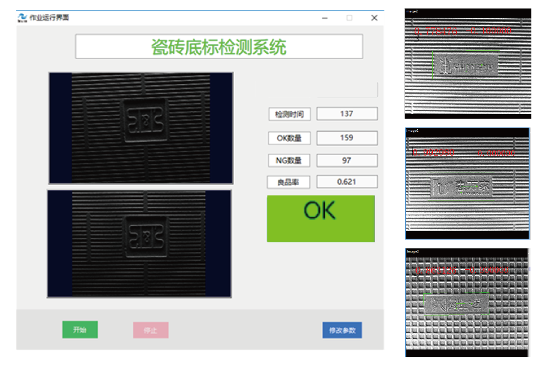 應對勞動力成本攀升和自動化升級的需要,針對陶瓷行業多種品牌瓷磚混燒下磚時有其他品牌瓷磚混入的情況,開發了窯尾陶瓷底標識別系統,識別非目標品牌并進行剔除,同時能夠支持目標識別品牌的快速切換,便捷的的作業設置,簡單的參數調節,應用于TOP陶瓷生產企業。